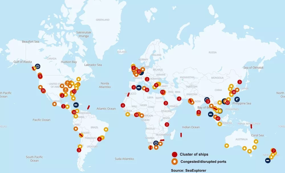 由物流巨头德迅(Kuehne+Nagel)创建的集装箱运输平台Seaexplorer发布了一份地图,突出了当今面临巨大压力的集装箱港口景象。